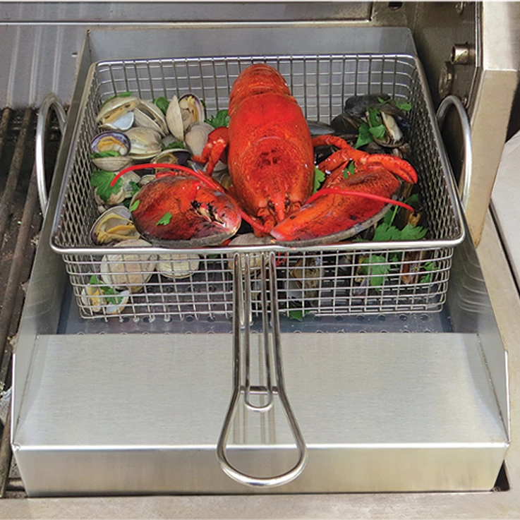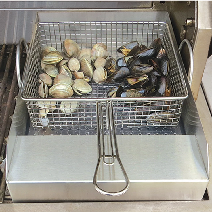 Drop this accessory into any Alfresco grill to blanch, steam, fry, or broil. From deep-fried chicken tenders and onion rings, to mussels, clams, and even lobster, no other outdoor grill has more cooking versatility! Simply remove cooking grate and nest this accessory into its place. Includes steaming pan, frying basket and stainless steel cover.