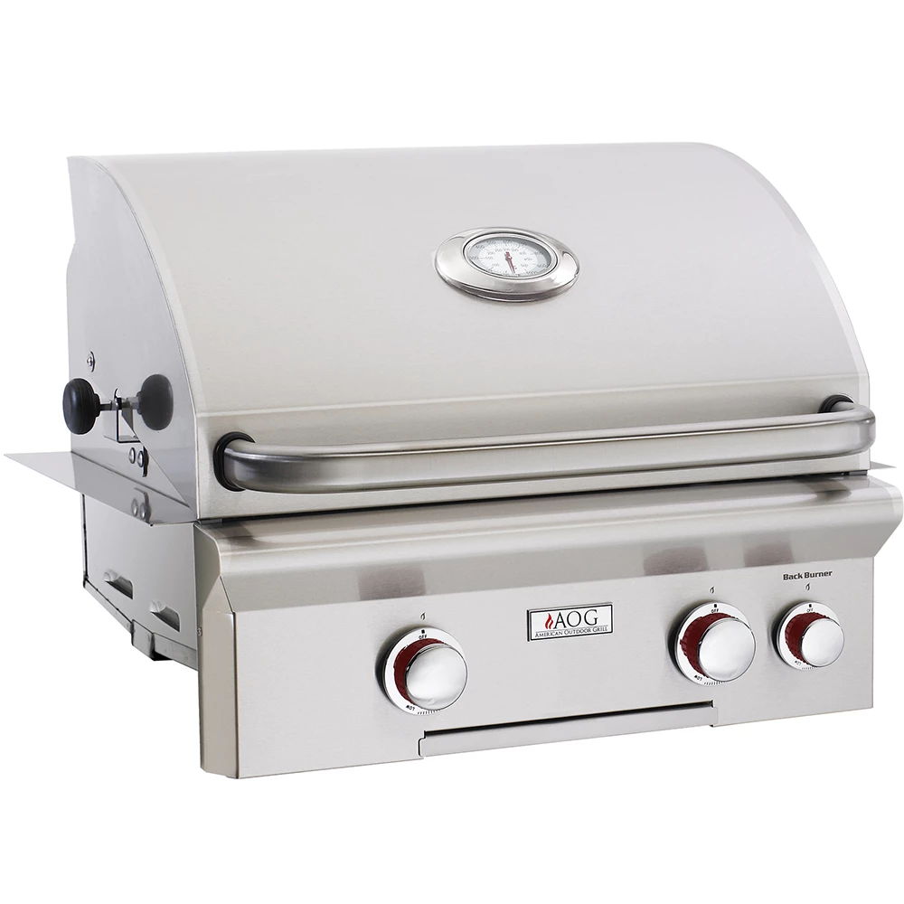 The American Outdoor Grill 24-inch 2-burner T-Series (24NBT) built-in natural gas grill with rotisserie is designed for long-lasting, unsurpassed performance that produces unbelievable flavor. All AOG built-in grills boast a stylish, sleek appearance, including the beautiful double-layered satin finish hood, stainless steel construction, and custom-designed analog thermometer with polished bezel. Proudly made in the USA and built to last, this AOG T-Series natural gas grill (24NBT) features commercial grade 304 series stainless steel construction, long-lasting stainless steel Diamond Sear cooking grids, heavy-duty warming rack, and highly sophisticated stainless steel 32,000 BTU U-shaped burners with integrated support posts for performance and durability. If you enjoy grilling veggies, steaks, and chicken all year long on an incredible grill, the first thing you will appreciate is the brand-new Piezo Rapid Light ignition, firing you up that much quicker with no electricity or batteries. Other great features on this grill include 432 sq inches of primary grilling space, stainless steel vaporizer panels (also called flame tamers) for even heat distribution, solid brass valves with red-flared front knobs for precise temperature control and longer life, and a funneled grease management system with slide-out drip tray for painless cleanup. Roast a better bird with the high-performance rotisserie kit with 10,000 BTU infrared back burner. Whether you enjoy entertaining the neighbors or rounding up the family for a fresh meal, the AOG 24-inch 2-Burner T-Series natural gas grill with rotisserie (24NBT) will add style and cooking excellence to compliment your outdoor lifestyle. All built-in American Outdoor Grills (AOG) are sold as natural gas units, propane gas (LP) offices are included with purchase and located in owners manual sleeve.