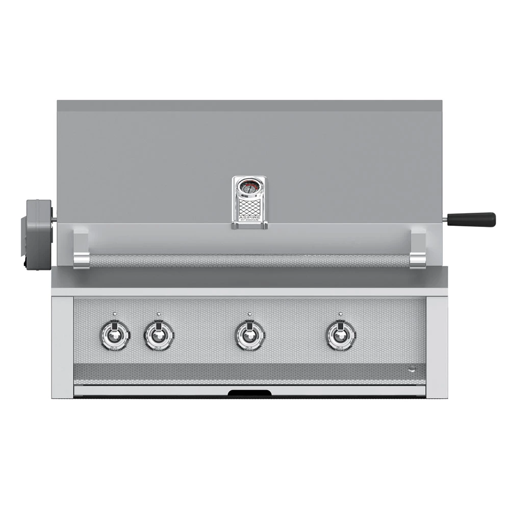 Aspire by Hestan built-in grills deliver exceptional power, masterful performance and heavy-duty resilience into standard enclosures or Aspire grill carts. Each unit is built in California from heavy-duty American steel. Incomparable features include spring-assisted hood, dual halogen lighting and flip-to-clean ceramic briquettes. This 36-inch gas grill has three (3) heavy-duty 304 stainless steel tubular burners that deliver 23,000 BTUs each of consistent heat and years of reliability. Built-in ceramic infrared rotisserie burner delivers searing heat from 12,000 to 18,000 BTUs and is located above the stainless steel rotisserie to lock in flavor and juices. Includes an external rotisserie motor with a single-speed, 3 rpm, 40 in-lbs motor and porcelain broiling pan with stainless steel rotisserie spit and forks. The patent-pending symmetrical flip-to-clean radiant tray generates sizzling flavor with ceramic disc briquettes across the 647-square-inch primary grilling surface, and the 183-square-inch warming rack surface makes room for large cookouts. This grill features a 304 stainless steel heavy-gauge, welded body construction with spring-assisted hood, and the patented Marquise Accented control panel with LED lighting and hood handle with commercial-grade end caps provide industry-exclusive durability and style. The hot surface ignition system provides consistent start-up and has a stainless steel removable drip tray for easy maintenance and cleanup. Proudly made in the USA, Aspire by Hestan backs their products with a lifetime warranty on welded body, stainless tubular burners and variable sear burners.