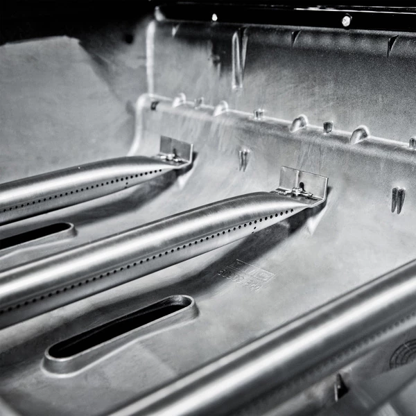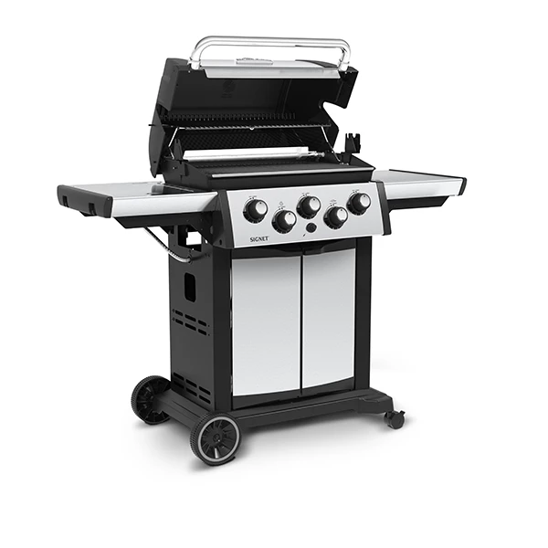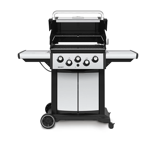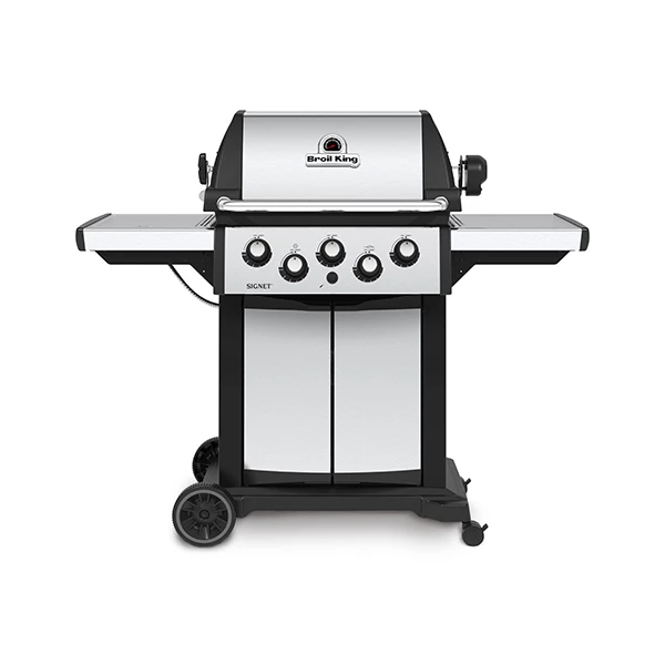 The Signet 390 features 635 sq. in. total cooking space including a porcelain coated warming rack, reversible heavy-duty cast iron cooking grids, stainless steel Flav-R-Wave cooking system, 3 stainless steel Dual-Tube burners, and stainless steel drop-down side shelves and enclosed cabinet base.
