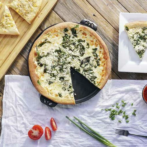 Enjoy a hot, fresh pizza just the way you like it. This large 14-inch pan makes for a perfect pizza anytime, anywhere. The two decorative handles make it easy to handle. This pan is also great for fruit or dessert pizzas.