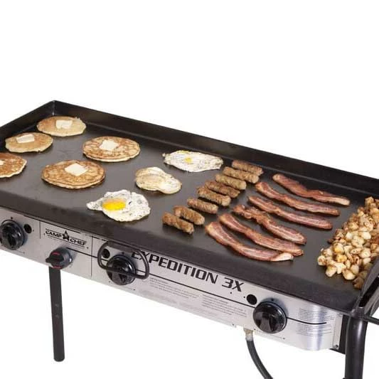 Whether you are at the family reunion or tailgate party, sometimes you just have to cook a lot of food for a lot of people. No matter the size of the crowd, the Professional Flat Top Griddle is big enough to get the job done. From cooking to clean up, the restaurant style sides and convenient grease drain make this griddle simple and easy to use. Heat diffuser plates have been added to evenly distribute heat and reduce hot spots on the griddle. The griddle comes pre-seasoned with The Camp Chef True Seasoned Finish making a natural cooking surface that is ready to use out of the box.