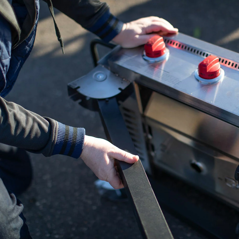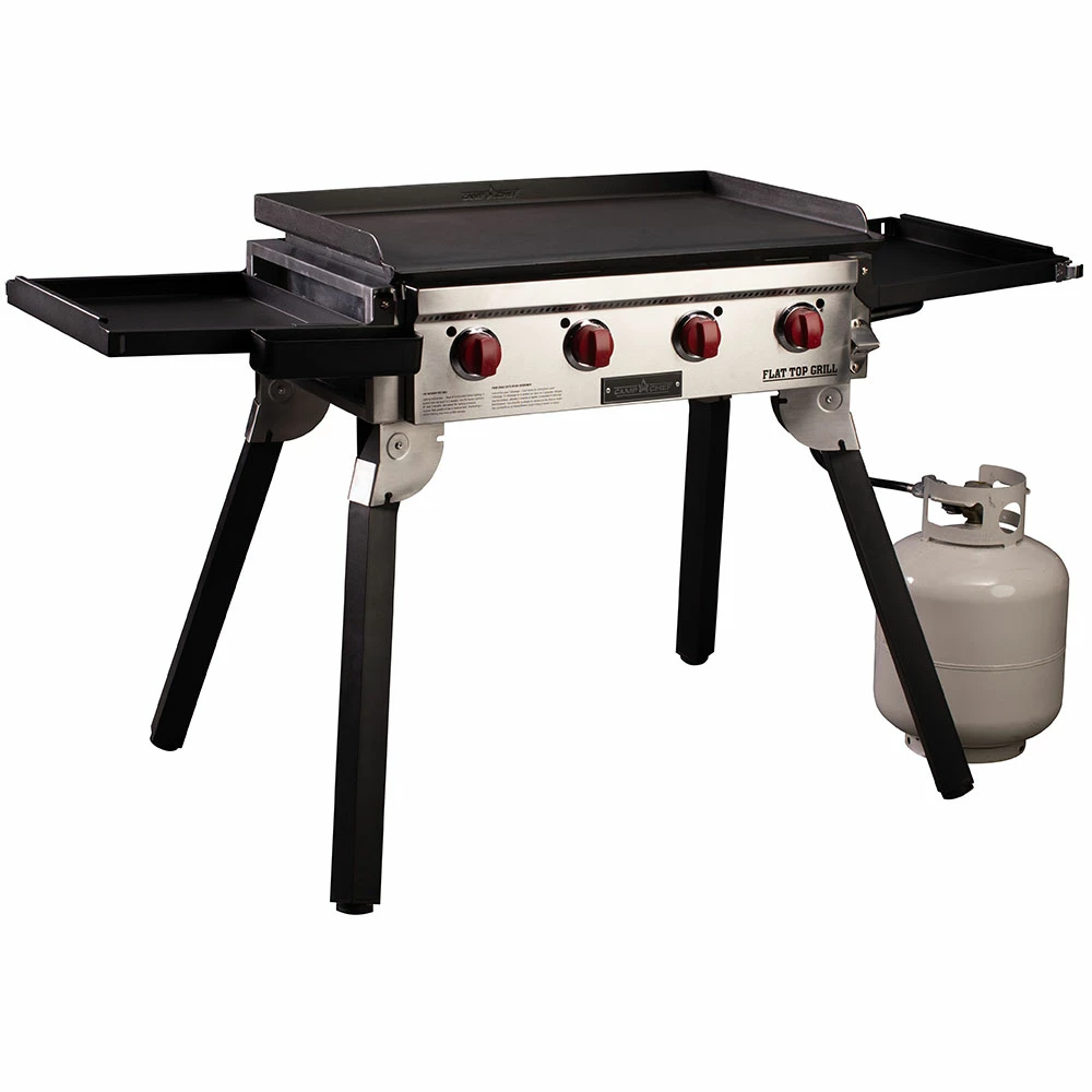 The Camp Chef 600 (FTG600P) brings the best of both worlds to your backyard patio or the campsite! The Camp Chef FTG600P features collapsable legs that convert your flat top griddle from a freestanding unit to a tabletop unit, within seconds. The FTG600P is perfect for tailgating, camping, backyard patio hangouts or a trip to the park for that perfect picnic. The Camp Chef FTG600P features a 604 square inch, pre-seasoned, cold-rolled steel cooking surface with a splash guard to keep food on the griddle, and is evenly heated by four 12,000 BTU stainless steel burners. The easy to use twist-and-turn ignition system is powered by simply turning the knob and features a safety valve and thermocouple to automatically cut off the gas supply in the event of accidental flame extinction, while ventilation cutouts allow proper airflow to prevent gas buildup and overheating. The stainless burners of the Camp Chef FTG600P sit in a powder-coated steel burner box and are independently controlled by three knobs on the front of the grill. Two large, powder-coated steel folding side shelves provide extra prep space, and two powder-coated steel shelves under the FTG600 grill provide storage space for tools or utensils. Micro-adjust griddle levelers and adjustable leg levelers ensure that you always have an even surface to cook on. A hose, regulator, and holding bracket are included for a 20-pound propane tank (tank not included). We imagine the Camp Chef Tabletop/Freestanding Flat Top Grill 600 accompanying you to the race track, tailgate, RV campsite, and hunting lodge, where ever your lifestyle takes you. Start your day by cracking some eggs, whisking up pancake batter, and throwing on a package of bacon. Bring on the burgers and dogs for a typical tailgate lunch or mix things up with a build your own fajita bar. The possibilities are endless on the Camp Chef FTG600P Portable Flat Top 600.