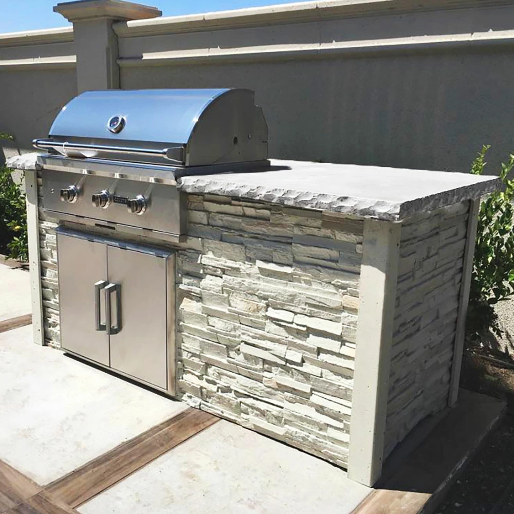 Coyote has partnered with RTA Outdoor Living and created one goal, to set out and remove the challenges associated with selecting, designing, and building an outdoor kitchen. RTA Outdoor Living has accomplished this by creating a unique building method that allows you to create an easy and affordable higher-quality alternative to conventional outdoor living construction. RTA Outdoor Living outdoor kitchen has simplified the construction process by using structural high-strength concrete panels (precast with a stone, wood or concrete face) that can be assembled in a few hours, with the help of a couple of people. In comparison, scratch-built and ready-to-finish (RTF) outdoor kitchens require multiple materials, steps, and trades to complete. RTA panels are self-supporting and aesthetic with no finish or masonry work required. Panels are simply set in place, attached with L-brackets and self-tapping screws, corners are mounted, countertop (included) and appliances are installed, and your outdoor kitchen is complete. RTA Outdoor Living BBQ islands are constructed of superior material technology. RTA Outdoor Living BBQ Island panels are approximately 3/4″ – 1 1/4″ thick and manufactured from a patented high-strength concrete composite with micro-fiber technology. Panels are engineered for outdoor environments, UV stable, virtually impervious to freeze/thaw cycles, and able to withstand all climates. The RTA Outdoor Living (RTAC-G6-SWLP) ready-to-assemble 6-foot outdoor kitchen island fits Coyote’s C-Series 34-Inch 3-Burner Built-In Propane Gas Grill (Model# C2C34LP) and Coyote’s 31-inch Stainless Steel Double Access Door (Model# CDA2431). Modern white stacked stone proprietary concrete island frame with a distressed white 1 1/4-inch thick chiseled-edge concrete countertop. Products shown must be purchased separately, the price listed is ONLY for the BBQ Island, no components are included.