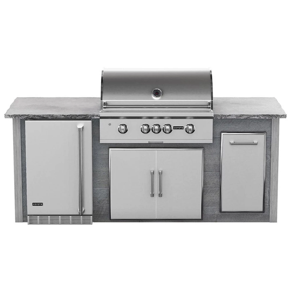 Coyote has partnered with RTA Outdoor Living and created one goal, to set out and remove the challenges associated with selecting, designing, and building an outdoor kitchen. RTA Outdoor Living has accomplished this by creating a unique building method that allows you to create an easy and affordable higher-quality alternative to conventional outdoor living construction. RTA Outdoor Living outdoor kitchen has simplified the construction process by using structural high-strength concrete panels (precast with a stone, wood or concrete face) that can be assembled in a few hours, with the help of a couple of people. In comparison, scratch-built and ready-to-finish (RTF) outdoor kitchens require multiple materials, steps, and trades to complete. RTA panels are self-supporting and aesthetic with no finish or masonry work required. Panels are simply set in place, attached with L-brackets and self-tapping screws, corners are mounted, countertop (included) and appliances are installed, and your outdoor kitchen is complete. RTA Outdoor Living BBQ islands are constructed of superior material technology. RTA Outdoor Living BBQ Island panels are approximately 3/4″ – 1 1/4″ thick and manufactured from a patented high-strength concrete composite with micro-fiber technology. Panels are engineered for outdoor environments, UV stable, virtually impervious to freeze/thaw cycles, and able to withstand all climates. The RTA Outdoor Living (RTAC-G8) ready-to-assemble 8-foot outdoor kitchen island fits Coyote’s Luxury S-Series 36-Inch Built-In Gas Grill (Model# C2SL36), Coyote’s 31-inch Stainless Steel Double Access Door (Model# CDA2431), Coyote 21-Inch 4.1 Cu. Ft. Outdoor Rated Compact Refrigerator (Model# CBIR) and Coyote’s 14-inch Single Pull-Out Trash & Recycle Bin (Model# CSTC). Stone gray weathered wood proprietary concrete island frame with distressed gray 1 1/4-inch thick chiseled-edge concrete countertop. Products shown must be purchased separately, the price listed is ONLY for the BBQ Island, no components are included.