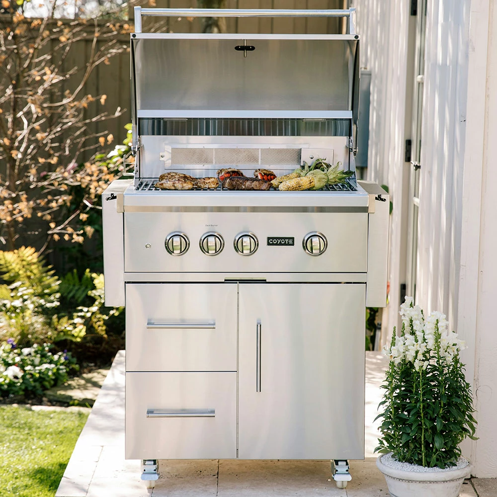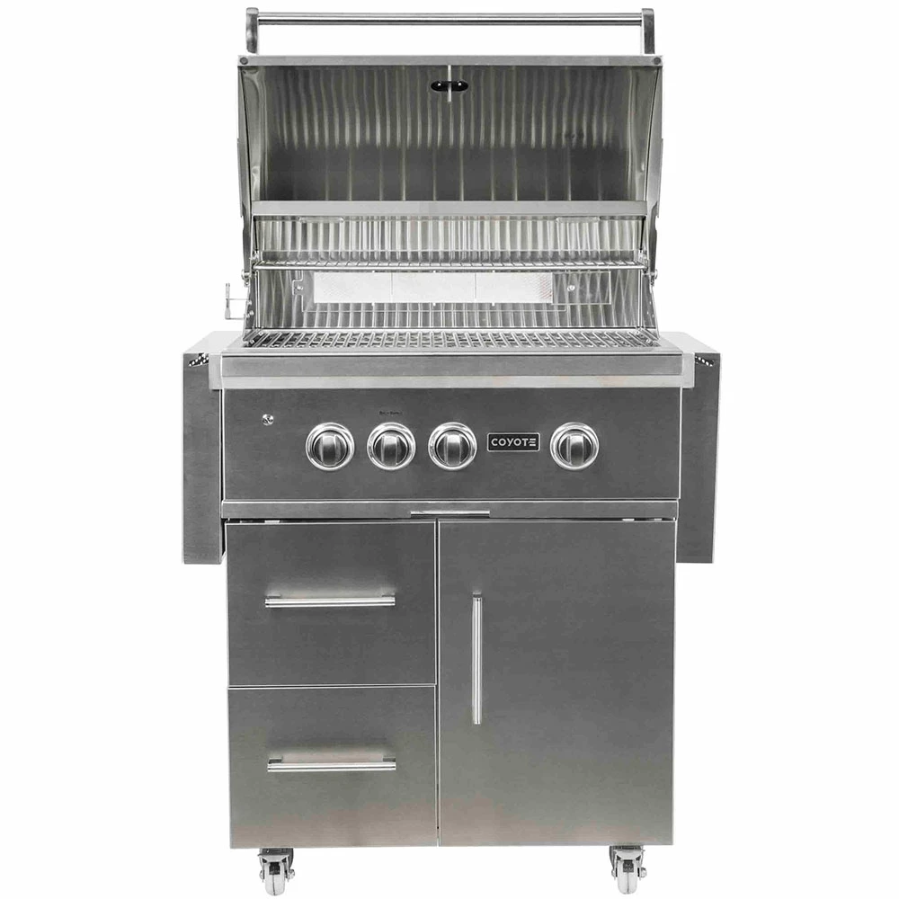 The Coyote C2SL30LP-FS S-Series 30-inch propane gas grill combines all the power and function of a luxury grill with the durability of a Coyote grill. The C2SL30LP-FS 30-Inch freestanding gas grill features 18 gauge 304-grade stainless steel construction with a double-walled canopy and continuously hand-welded grill box with seamless edges. The C2SL30LP-FS gas grill offers performance enhancing ceramic briquette trays that minimize flare-ups and distribute heat evenly across the 500 square inch cooking area. This propane gas grill is powered by two, durable cast stainless steel Infinity burners and one RapidSear infrared burner which delivers up to 55,000 BTUs of cooking power. Enjoy expanded grilling options using the 15,000 BTU infrared rear rotisserie burner to create succulent, slow-roasted meals. Use the included smoker box to infuse your grilled food with delicious smoke flavor. The burners are lit by an easy to use, push and turn ignition system while the internal halogen grill lights will keep you grilling into the night. This Coyote grill also sports stylish, orange LED illuminated control knobs. Use the removable warming rack to keep food heated until serving time and easily monitor the temperature inside your grill using the integrated thermometer. Choose Coyote and create the outdoor kitchen of your dreams with a grill made to last and give remarkable performance. The C2SL30LP-FS grill cart includes two, self-closing doors for easy closures and fold down shelving which adds workspace to your grilling area. The double doors provide ample storage space for BBQ tools and grilling accessories. The cart also features industrial-style, locking wheel casters for portability and comes fully assembled so you can start cooking right away.