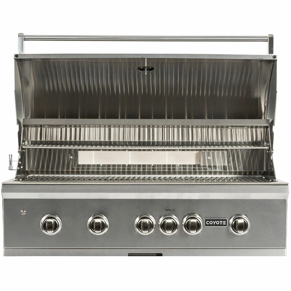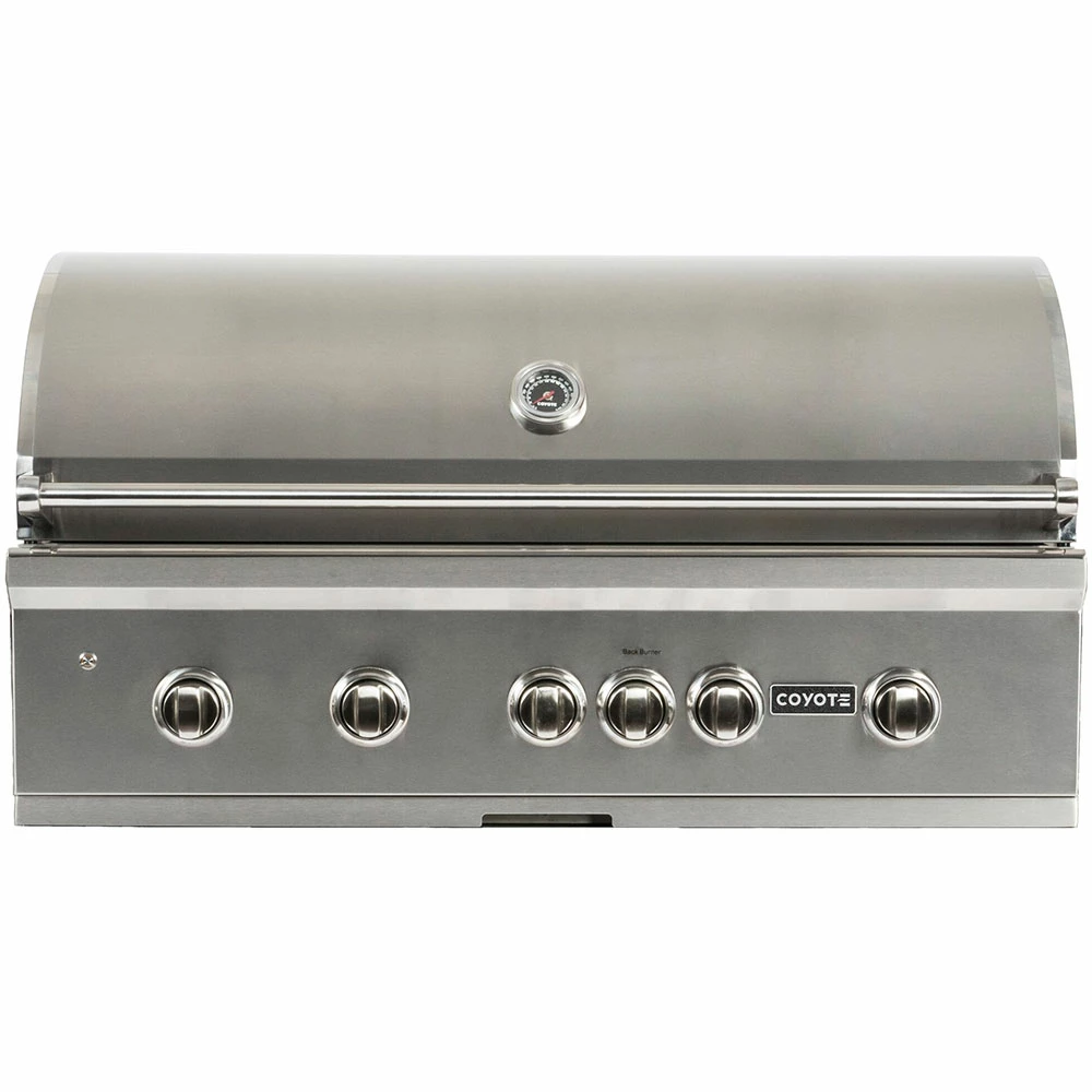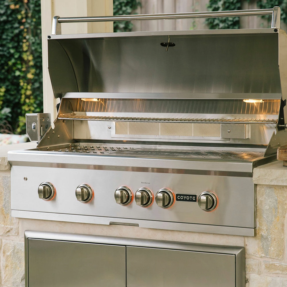 The Coyote C2SL42LP S-Series 42-inch propane gas grill combines all the power and function of a luxury grill with the durability of a Coyote grill. The C2SL42LP 42-Inch built-in gas grill features 18 gauge 304-grade stainless steel construction with a double-walled canopy and continuously hand-welded grill box with seamless edges. The C2SL42LP gas grill offers performance enhancing ceramic briquette trays that minimize flare-ups and distribute heat evenly across the 800 square inch cooking area. This natural gas grill is powered by three, durable cast stainless steel Infinity burners and one RapidSear infrared burner which delivers up to 100,000 BTUs of cooking power. Enjoy expanded grilling options using the 15,000 BTU infrared rear rotisserie burner to create succulent, slow-roasted meals. Use the included smoker box to infuse your grilled food with delicious smoke flavor. The burners are lit by an easy to use, push and turn ignition system while the internal halogen grill lights will keep you grilling into the night. This Coyote grill also sports stylish, orange LED illuminated control knobs. Use the removable warming rack to keep food heated until serving time and easily monitor the temperature inside your grill using the integrated thermometer. Choose Coyote and create the outdoor kitchen of your dreams with a grill made to last and give remarkable performance.