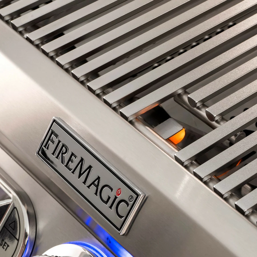 When only the best will do, the top of the line Fire Magic Echelon grill combines the ultimate in performance, beauty and innovation. With sleek lines, a unique contoured face and state of the art features such as hot surface ignition, blue back lit knobs, and Quantum backburner. Echelon Diamond defines luxury in grilling. Featuring 660 square inches of cooking space, this 30-inch gas grill has patented Diamond Sear cooking grids with 304 stainless steel bars that have a smooth flat top, shaped to optimally transfer the heat from the burners to the cooking surface so food cooks faster and more evenly! The Flavor Grids are made of 16-gauge 304 stainless steel and allow heat to rise unobstructed from the burner to cooking grids. They disperse heat quickly and evenly flavor the food by vaporizing juices and minimizing flare ups. The three(3) thick cast 304 stainless steel burners boast 75,000 BTUs of cooking power and are guaranteed for life. The recessed infrared quantum backburner uses 100-percent stainless steel foam, providing 11,000 BTUs of heat for quicker, more efficient rotisserie grilling with the included rotisserie kit. Enhance the flavor of the food you grill with the included stainless steel charcoal smoker basket that sits on top of the burner easily igniting the charcoal or wood chips. Lighting your grill is easy with the comfort touch back-lit polished knobs and included hot surface ignition for a reliable start. Control your grill with the state-of-the-art electronic thermometer display, which allows you to operate all cooking zones at one temperature, or control each zone independently to grill a variety of foods at once. The digital display also allows you to check the status of the included meat probe or turn on the interior halogen lights.