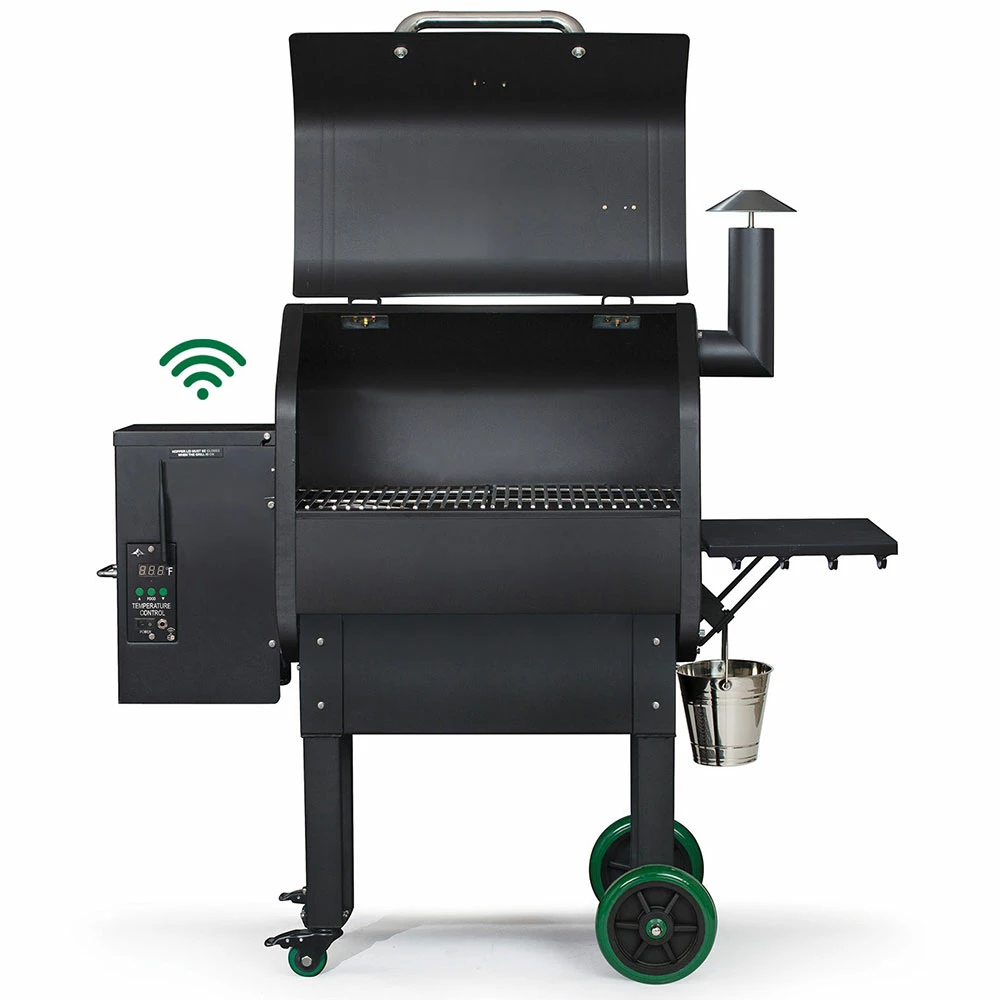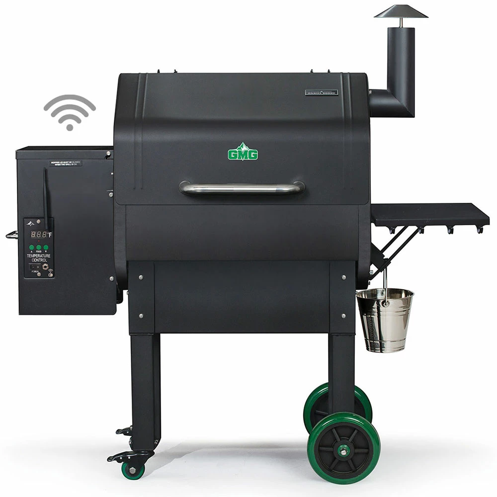 The Green Mountain Grills Daniel Boone comes with a digital control, a meat probe, a peaked lid for stand-up chicken/large fowl/rib racks, a convenience tray with utensil hooks, hard rubber tires, and a venturi-style firebox for cyclone combustion. The 13 1/2-inch peaked lid provides enough space for a stand-up chicken to a dozen racks of ribs. Keep all of your grilling tools handy by hanging them on the utensils hooks of your side convenience tray. The Green Mountain Grills Daniel Boone has a venturi-style firebox that creates a cyclone flame that ensures maximum combustion. The Green Mountain Grills Daniel Boone also has a Sense-Mate, a thermal sensor that constantly monitors the ambient temperature. When the weather gets cold, the sensor kicks the grill into Turbo Mode, so you don’t have to wait long for the grill to heat up! Other features include Keep Warm Mode and Fan Only Mode with automatic shut-off to blow ash out of the firebox after you finish grilling. With micro-adjustment capability in the variable-speed fan and auger motor, you can maintain more consistent grill temps. With a 13 1/2 inch peaked lid and 658 sq. in. of grill space this workhorse can cook anything from a dozen racks of ribs to a small whole hog and monitor multiple food temps with dual meat probes. Control and monitor your grill from your couch or on the go with GMG Smart Control. Adjust your smoke and grill temp from 150°F to 550°F with 5° increment control. Adjust and monitor your food temp from your phone with the GMG App. Grill smarter, eat better!