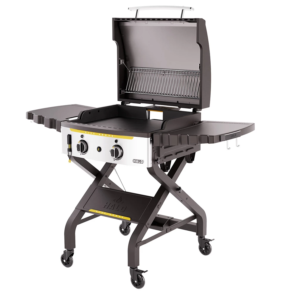 Transform your outdoor cooking experience with the Elite2B Griddle. With 480 square inches of cooking surface, this griddle is the perfect choice for on-the-go, hosting tailgate parties, camping or entertaining guests at backyard gatherings. Boasting 2 burners with 4 temperature zones, you can precisely control the heat distribution across the entire cooking surface. Ignite just the front zones, or light up all zones for wall-to-wall heat. The inset griddle plate design ensures that your flame stays lit even in windy conditions, and the built-in bubble level and adjustable 360 degree wheeling casters allow you to easily move the griddle to any location and keep it level. The innovative burner site glasses of the HALO allow you to monitor the flame from the front of the griddle, for quick and easy ignition check. With a quick warm-up time of just 10 minutes, you can reach temperatures between 300 degreeF to 700 degreeF in no time and start cooking up a variety of delicious meals, from breakfast dishes to stir-fry, burgers, steaks, and skewers. The swing-away warming rack provides extra space when you need it and can be tucked away when not in use. When you?re finished cooking, cleaning is a breeze thanks to the XL rear grease management system and built-in utensil clean-off squeegee. So, upgrade your griddle game with the Elite2B and start cooking like a pro!