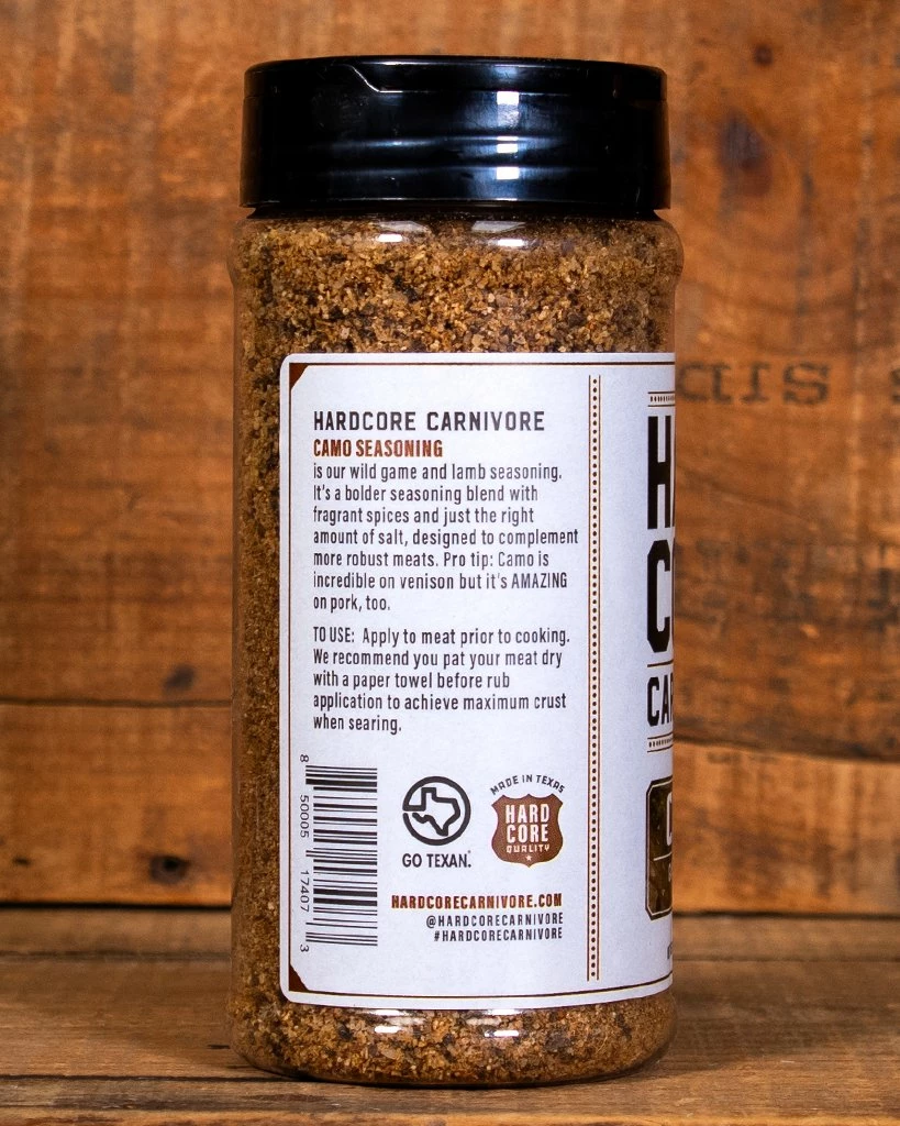 Hardcore Carnivore Camo Seasoning is out wild game and lamb seasoning. It’s a colder seasoning blend with fragrant spices and just the right amount of salt, designed to complement more robust meats. Pro tip: Camo is incredible on venison but it’s AMAZING on pork, too.Â