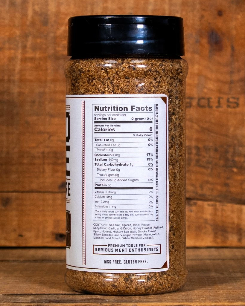 Ingredients: Sea salt, spices, black pepper, dehydrated garlic and onion, honey powder (refined syrup, honey), hickory salt (salt, smoke flavor, silicon dioxide), and vinegar powder (maltodextrin, modified food starch, white distilled vinegar). MSG Free. Gluten-Free.