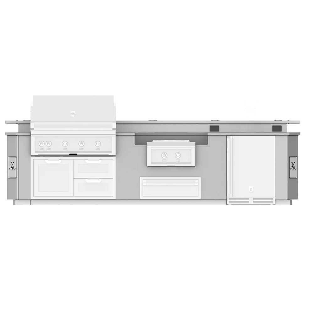 The ultimate in luxury, the Hestan Outdoor Living Suite with Power Burner offers an install-friendly upgrade with cutouts for a grill, power burner, storage and undercounter refrigeration. Heavy-gauge, welded body construction and stainless steel front, sides and bottom weathers the elements in style. It comes equipped with weatherproof outlets and single-point gas and electrical connections to streamline fuel and power for all of your Hestan Outdoor products. 12-foot Outdoor Living Suite with Power Burner consists of multiple cutouts (appliances sold separately) in a suite to accommodate: 42-inch Hestan Built-in Grill, 42-inch Hestan Access Door or Drawer/Door Cabinet, 24-inch Hestan Power Burner, 30-inch Hestan Storage Drawer, 24-inch Hestan Refrigeration Product. Fully welded 1-piece stainless countertop and fully welded 1-piece stainless raised bar with Marquise belly bar, stainless backsplash with electrical outlets and waterproof outlet covers (two in 12 foot suite).
