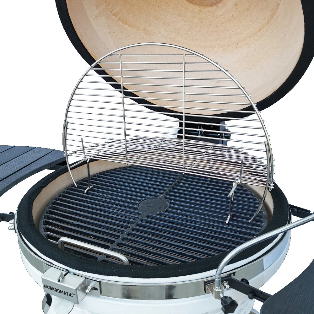 An ancient art finally mastered and in your back yard. Now, the ability to make unparalleled, savory meals is right at your fingertips. With 714 square inches of cooking space, this Vision XD702 Maxis ceramic kamado grill allows you to sear, grill, and smoke all year round. Features a thick, competition-level ceramic fire bowl for greater heat retention, a cast iron top vent with color-coded HeatZone control, a bottom vent with the color-coded HeatZone cooking dial, as well as a temperature gauge with color-coded cooking zones for superior temperature control. Includes a two-tier cast iron and stainless steel cooking grate, flexible grill light for night-time smoking, and a durable cover to protect while not in use. Starting this kamado grill is easy with the convenient electric starter port and included electric starter and cleanup is simple with the removable ash drawer. Built for stability, this ceramic charcoal grill sits on an extra-wide 26-inch storage cart with 3-inch locking casters, and has an easy-lift lid with a stainless steel shock absorber, upgraded felt and locking latch for a superior seal. Keep your grilling tools close with the wood-sculpted folding slatted side shelves with accessory hooks.