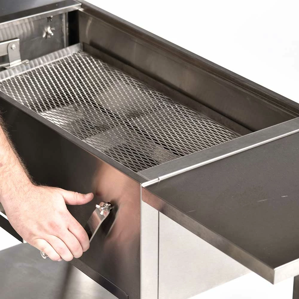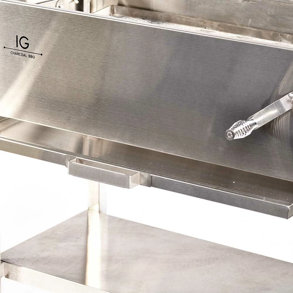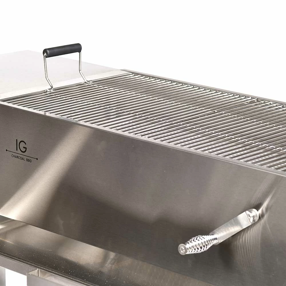Enjoy nostalgic charcoal grilling on the durable IG Charcoal BBQ grill. The IG BBQ grill is especially great for grilling skewers with a total cooking surface of 503 square inches (30 1/2 Wide x 16 1/2 D), utilizing a thick, bi-folding stainless steel cooking grate. Features include a multi-functional grill top for skewers, a rotating charcoal handle for raising and lowering the charcoal heat level, an easy sliding ash collector tray for cleanup, and folding side shelves for condiment space. This unit also provides a storage shelf below the grill top. The grill also has 4 heavy-duty casters/wheels for mobility.