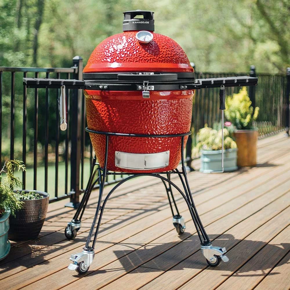 The Kamado Joe KJ23RHC Classic Joe II 18-Inch Ceramic Grill features a thick-walled, heat-resistant shell that locks in smoke and moisture at any temperature. The easy-open dome includes our counterbalanced Air Lift Hinge and element-proof, ultra-precise Kontrol Tower top vent, while the large cooking surface underneath is crafted from commercial-grade 304 stainless steel. Other featured innovations that come standard with the Kamado Joe Classic Joe II include the Divide and Conquer Flexible Cooking System, Advanced Multi-Panel FireBox, a heavy-duty rolling cast iron cart, and a patented slide-out ash drawer for easy cleaning. The Kamado Joe KJ23RHC kamado grill is constructed from 1 1/4-inch thick ceramic that holds heat, maintain any temperature and is extremely porous to keep moisture in your meat, producing incredibly juicy, tender food with a true wood-fired flavor. Cook for the whole family on the 304-grade stainless steel cooking grate that measures in at 254 square inches. Cook on two different levels at once using the Divide and Conquer Flexible Cooking System or use the two split heat deflectors for indirect cooking and baking for truly versatile cooking. The patented Kontrol Tower top vent maintains a consistent air setting for precise temperature management, and it will not slip out of position as the lid is opened. The top vent is constructed with cast aluminum for superior resistance to rust. The dome lid and base feature a double thick, wire mesh fiberglass gasket which offers a superior air-tight seal and long-lasting performance. The stainless steel lid latch self activates when you close the lid, ensuring heat does not leak through the seal. The fire grate is made of powder-coated cast iron for durability and superior heating performance, while the patented slide-out ash drawer makes cleanup easy. The airlift hinge reduces the dome weight by 96%, making it easy to lift the heavy ceramic lid with the high-density polyethylene (HDPE) handle. The lid will also stay open at any desired position, allowing you to cook with the lid partially open if you choose to. The heat-resistant ceramic coating is sure to keep your grill looking as good as it performs and the matching side shelves provide a workplace for your grilling essentials. The KJ23RHC Classic Joe Kamado grill comes with a free grill gripper for handling hot cooking grates and an ash tool for safely and easily removing ashes. The Classic Joe also includes a flexible cooking rack and heat deflector.