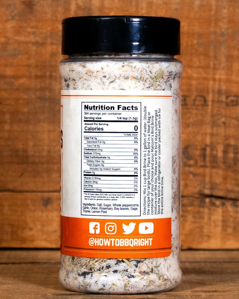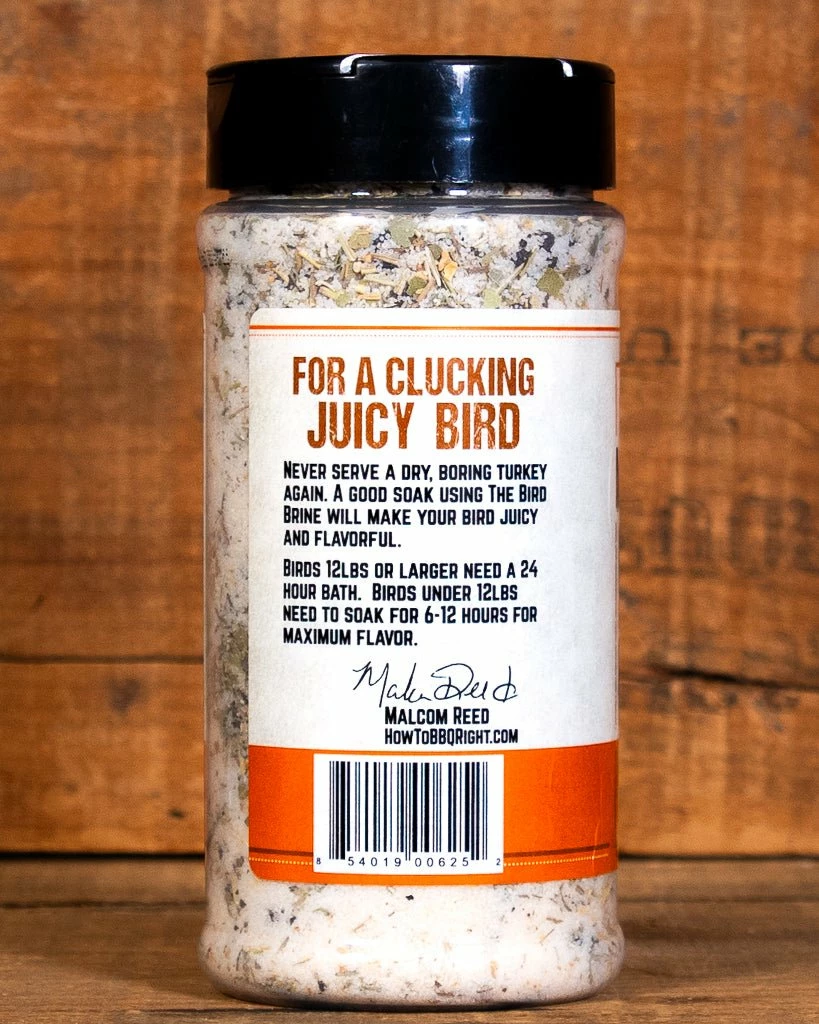Mix 1 cup Bird Brine to 1 gallon of water. (double the recipe for large birds). Place the bird (turkey, chicken, goose, duck, etc…) in a Meat Bag or container of your choice and pour Malcom’s Bird Brine mixture over the top. Make sure the bird stays submerged – weigh down with a plate if necessary. Store the bird in a refrigerator or cooler packed with ice for the entire brine time.