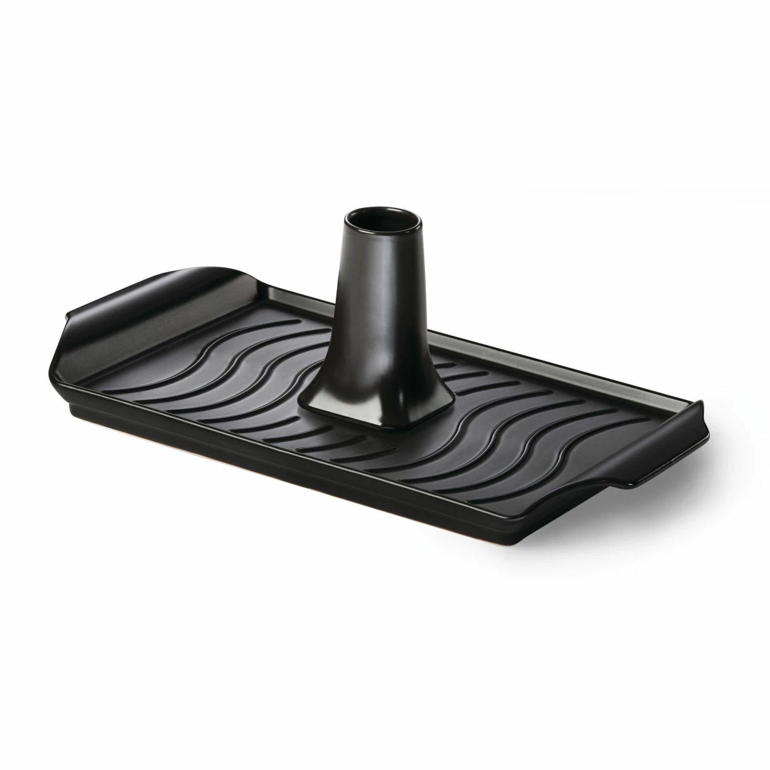 The Ceramic Roasting Pan And Beer Can Chicken Roaster Set features the iconic Wave patterned ridges and a detachable chicken holder for making beer can chicken. The nonstick glazed ceramic coating is perfect for roasting and baking everything from tasty vegetables to your favorite roast meats. Attach the roasting cylinder to infuse a roast chicken or turkey with your favorite flavored liquids like beer or juice. Cleanup is easy, everything in this set is dishwasher safe. The pan is a generous 19-inches by 10-inches (48 cm x 25 cm) and will easily hold chickens of three to six pounds.