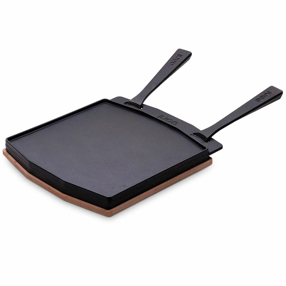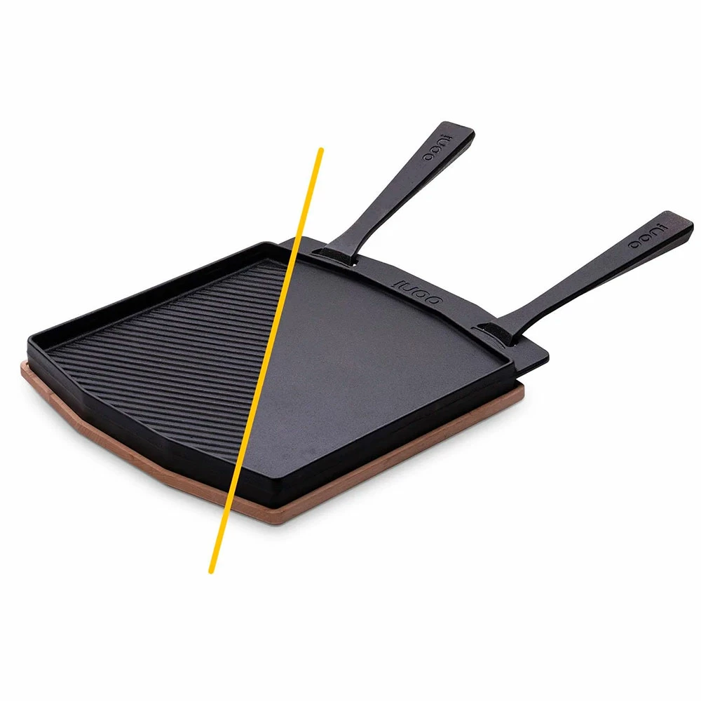 This cast iron pan is the perfect size for use with all your Ooni ovens! Is it a Griddle? Is it a Sizzler? It’s both! Say hello to the Ooni Dual-Sided Grizzler Plate. Use the versatile smooth Sizzler side for fajitas or frying eggs, or flip and use the Ooni Grizzler ribs for those picture-perfect seared grill marks on the meats. Use the bespoke designed removable handles to safely move the Ooni Dual-Sided Grizzler Plate in and out of the oven when hot, or serve it straight to the table on the included beech wood serving board. Our Dual-Sided Grizzler is the accessory that stole the show on the Ooni Koda 16 video! See it in action with sizzling steaks, fish, and veggies. Load up that extra large cut of beef and sear it off in your Ooni pizza oven. The cast iron Ooni Dual-Sided Grizzler Plate fits inside all of our pizza ovens, so you can go beyond stone-baked pizza to make a range of larger flame-cooked dishes for a crowd. Dimensions: 14.5 x 12.9 x 2.7? (37 x 33 x 7cm). Weight: 13lb (6.1kg). Materials: Cast iron, 100% Beech board. Compatible with all 12? and 16? Ooni pizza ovens