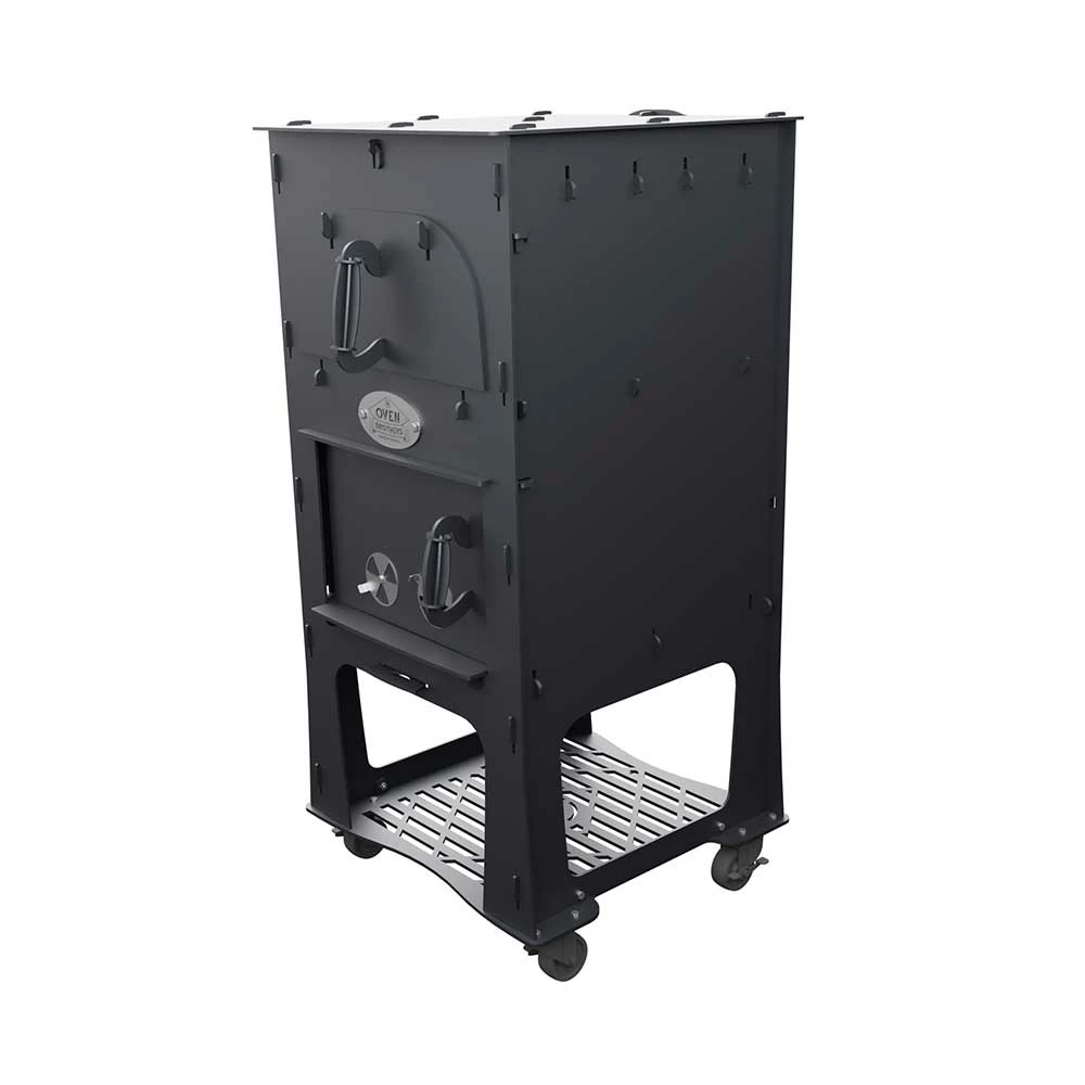 The patented no tools assembly wood-fired oven design allows for a more heat-efficient cooking surface than other traditional outdoor stone pizza ovens. Using thick high-quality carbon steel that has been CNC laser cut along with high-quality fire brick results in an oven that will outlast the competition, retain more heat, burns less fuel, and requires minimal to no maintenance. Did we mention that you can disassemble your oven and take it with you? The Oven Brothers “The Original Bro” series is the first-ever “flat packed” high-quality carbon steel outdoor wood-fired pizza oven of its kind. With its easy assembly, and the ability to be taken with you when you move; our ovens will last a lifetime. The Oven Brothers Original Bro pizza oven is a workhorse oven for the family that loves to entertain and wants to look good doing it. With its 17-inch width by 20-inch depth by 6-inch height cooking space, you can cook anything from a 16-inch pizza to dinner rolls and dessert for your next family BBQ. Customize your oven with high heat paint or leave it to patina naturally. Not only does it give you that industrial look, but it can also cook up to ninety (90) pizzas an hour (1). A two-person approach to assemble our ovens is recommended. We proudly achieved a “no tools, no hardware” assembly process with our unique interlocking design allowing for an assembly time of an hour and a half or less. Plus, it comes with a custom wheel kit which allows for greater mobility & versatility.