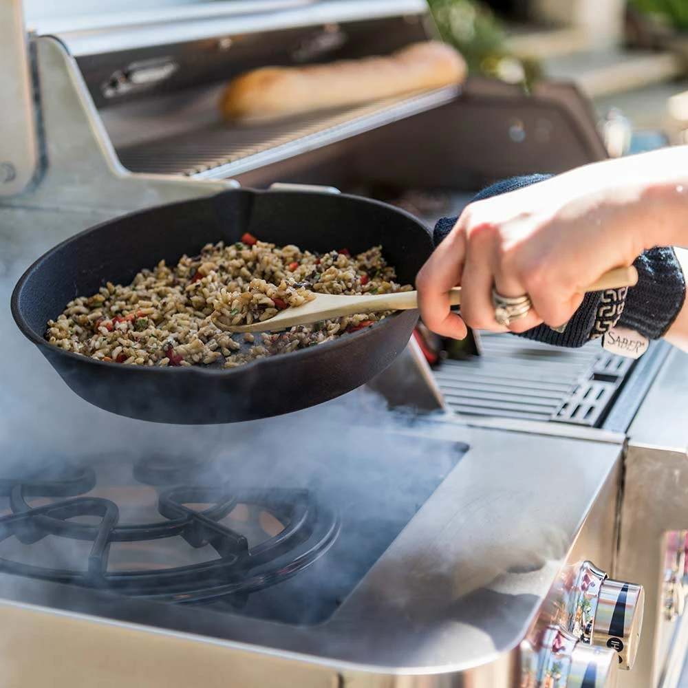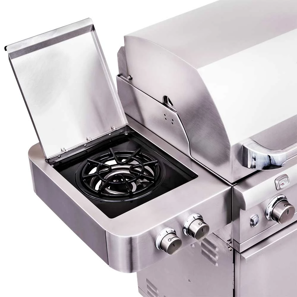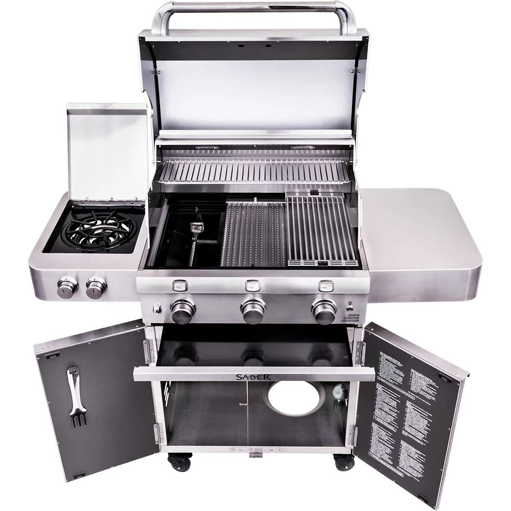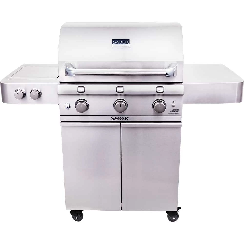 The Saber Grills (R50SC0017) Stainless 500 3-Burner Infrared Gas Grill combines a stainless steel lid with 304-grade stainless steel and patented cooking technology for luxurious backyard grilling. The patented Saber infrared cooking system allows you to cook up juicier and more flavorful meals than traditional systems that use dry convection air. The unique SABER cooking grates and infrared emitters prevent flare-ups and direct airflow away from the cooking surface, providing evenly distributed, indirect heat for maximum moisture retention while grilling. The cooking grates also catch any drippings and debris, protecting the burners and creating that familiar BBQ sizzle as foods are infused with more juicy flavor. Designed with fuel efficiency in mind, the Saber Grills infrared cooking system delivers quality results faster than most gas grills while consuming 30-percent less fuel. The burners, emitters, and cooking grates are made of 304 commercial grade stainless steel, ensuring long-lasting performance in your outdoor patio. The Saber Grills R50SC0017 Stainless 500 32-inch propane gas grill features a stainless steel lid. Three 8,000 BTU gas burners, provide evenly-distributed heat across a 500 square-inch cooking surface. An adjustable, stainless steel warming rack folds down to keep foods warm and can be folded away for additional space when using a rotisserie kit with the integrated rod holders (rotisserie kit sold separately). Precisely manage grilling temperatures across three cooking zones and ensuring reliable start-up with integrated push-button electronic ignition. Three grate-level temperature gauges with annealed stainless steel bezels allow you to easily monitor grilling temperatures, even while the lid is lifted. Two stainless steel side shelves provide a convenient workspace with die-cast BBQ tool holders and a towel bar, as well as an 18,000 BTU dual-ring side-burner on the left shelf for preparing sides and sauces while you grill. Cleaning your Saber grill after meals is easy thanks to the stainless steel burner boxes, firebox liners, and front-access grease tray, simply burn off and brush away any remaining debris with the included grate scraper. The Saber EZ assembly cart features fully-enclosed, stainless steel storage space with stainless steel access doors and has heavy-duty, nylon locking casters for easy placement.