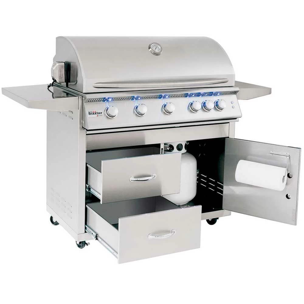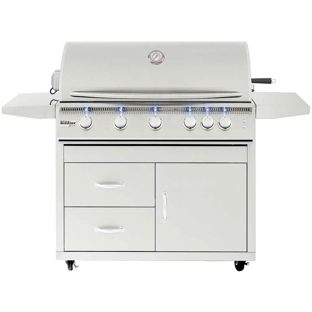 The Sizzler Pro (Sizzler Professional Series) combines features, quality construction, and affordability all into a revolutionary gas grill. The Summerset Grills Sizzler Pro Series (SIZPRO40-NG + CART-SIZ40-DC) 40-Inch Freestanding Natural Gas Grill is a premium gas grill at an unbeatable price. Constructed in all commercial-grade stainless steel and designed with careful precision to ensure optimal airflow and even heating, the Summerset Grills SIZPRO40-NG + CART-SIZ40-DC gives its higher-priced competitors a run for their money in both durability and grilling performance. The Summerset Sizzler Pro grill will impress the most discriminating of grillers. The Summerset Grills Sizzler Pro Series 40-inch natural gas BBQ grill (SIZPRO40-NG + CART-SIZ40-DC) features five(5) cast stainless steel burners, for 70,000 BTUs of total cooking power. The 40-Inch Summerset Sizzler Pro grill offers a 15,000 BTU ceramic rear rotisserie burner that expands cooking options, allowing you to slow roast poultry and other meats (rotisserie kit is optional). Have full cooking control of your Summerset SIZPRO40-NG + CART-SIZ40-DC with heat zone separators, thick, heavy-duty pieces of stainless are placed in between each burner to allow for proper cooking temperature and create ‘zones’ in your gas grill. The SIZPRO40-NG + CART-SIZ40-DC Summerset Grill also features an easy-clean briquette system, which helps reduce flare-ups and ensures the grill has even heating across the grilling surface. Reliable startup every time, with the Sure-Strike ignition system. Backup flash tubes, with cross over tubes between burners, allow for one burner to easily light off the other. Large, easy to turn control knobs with rugged surround make operation simple, above each light, bright blue LED lights illuminate the knobs for beautiful nighttime aesthetics. A stainless steel warming rack keeps freshly grilled meals ready for eating, and the full drip tray makes cleanup effortless. With 683 square inches of primary and 202 square inches of secondary, this large 985 square inches of the overall cooking surface is perfect for grilling for a large party. The stainless steel deluxe grill cart features double access drawer storage with a single access door (door and drawer combo), two(2) fixed side shelves, paper towel holder behind right door, propane tank storage and locking casters.