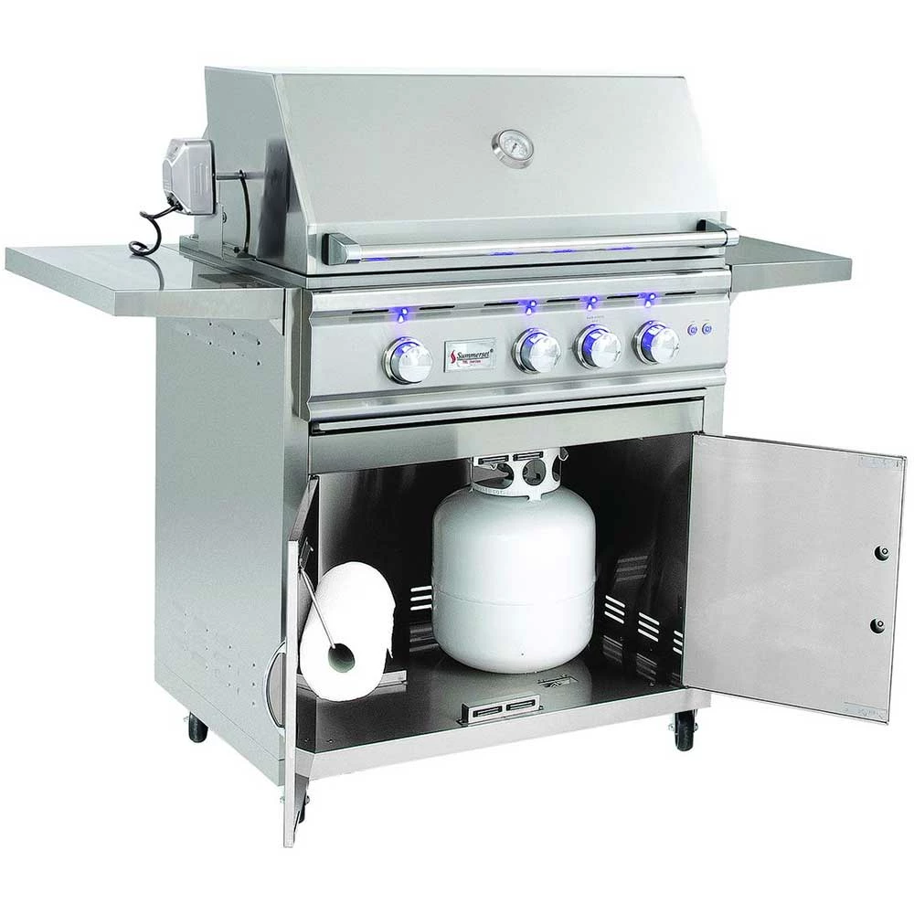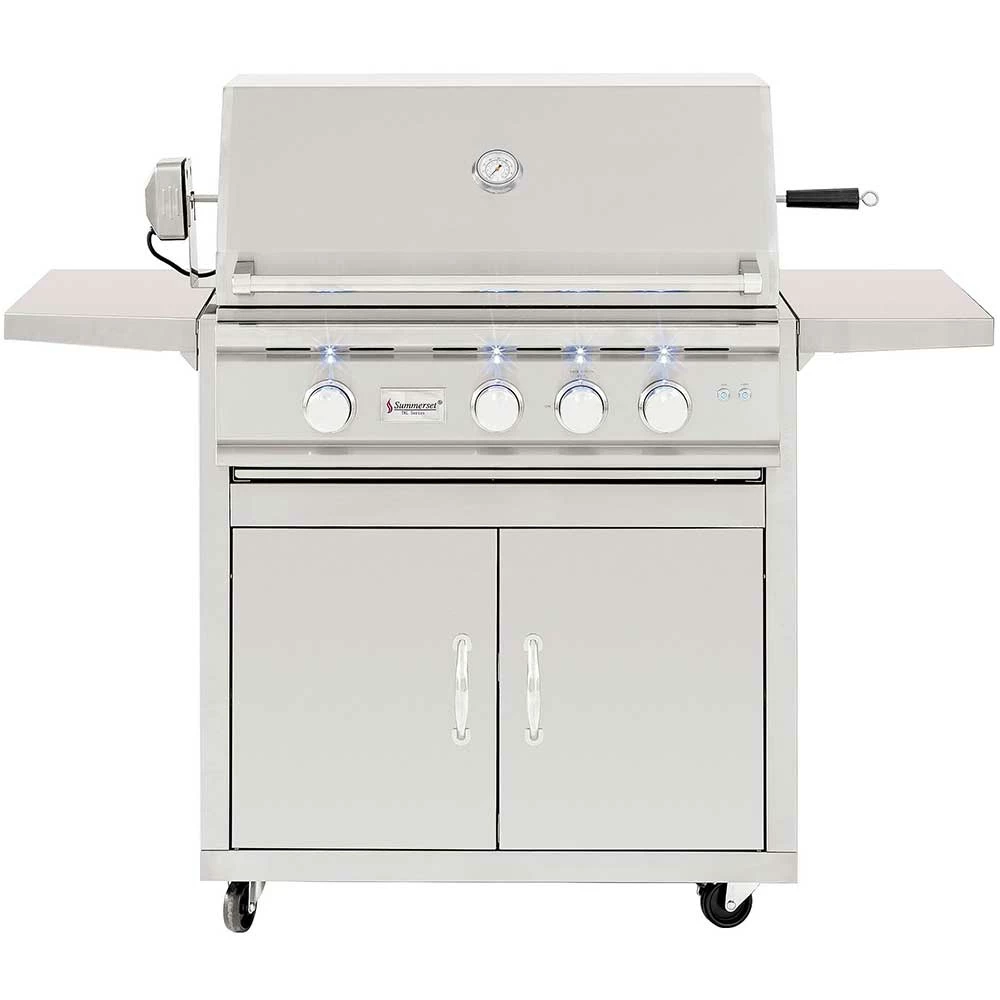 The Summerset TRL grill is a fully-loaded workhorse, a grilling classic packed with luxury features. The Summerset Grills TRL Series (TRL32-NG + CART-TRL32) 32-Inch Freestanding Natural Gas Grill is a luxury gas grill at an unbeatable price. Constructed in all commercial-grade stainless steel and designed with careful precision to ensure optimal airflow and even heating, the Summerset Grills TRL32-NG + CART-TRL32 gives its higher-priced competitors a run for their money in both durability and grilling performance. The Summerset TRL grill will impress the most discriminating of grillers. The Summerset Grills TRL Series 32-inch natural gas BBQ grill (TRL32-NG + CART-TRL32) features three(3) stainless steel u-tube burners, for 54,000 BTUs of total cooking power. The 32-Inch Summerset TRL grill offers a 15,000 BTU ceramic rear rotisserie burner that expands cooking options, allowing you to slow roast poultry and other meats (rotisserie kit is included). The TRL32-NG + CART-TRL32 Summerset Grill also features an easy-clean briquette system, which helps reduce flare-ups and ensures the grill has even heating across the grilling surface. Reliable startup every time, with the Flame-Thrower ignition system. Backup flash tubes, with cross over tubes between burners, allow for one burner to easily light off the other. Large, easy to turn control knobs with rugged surround make operation simple, above each light, bright blue LED lights illuminate the knobs for beautiful nighttime aesthetics. A stainless steel warming rack keeps freshly grilled meals ready for eating, and the full drip tray makes cleanup effortless. With 607 square inches of primary and 248 square inches of secondary, this large 855 square inches of the overall cooking surface is perfect for grilling for a large party. The stainless steel grill cart features double access door storage, two(2) fixed side shelves, paper towel holder behind left door, propane tank storage and locking casters.