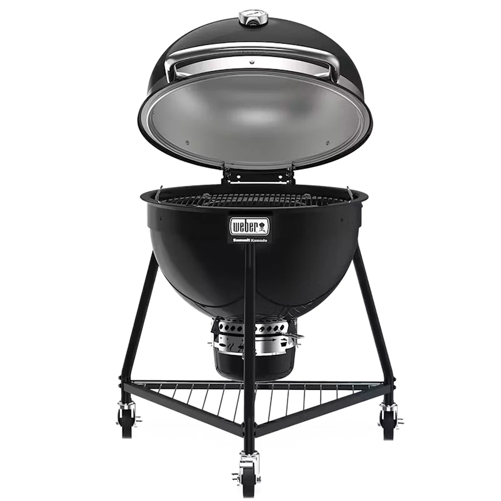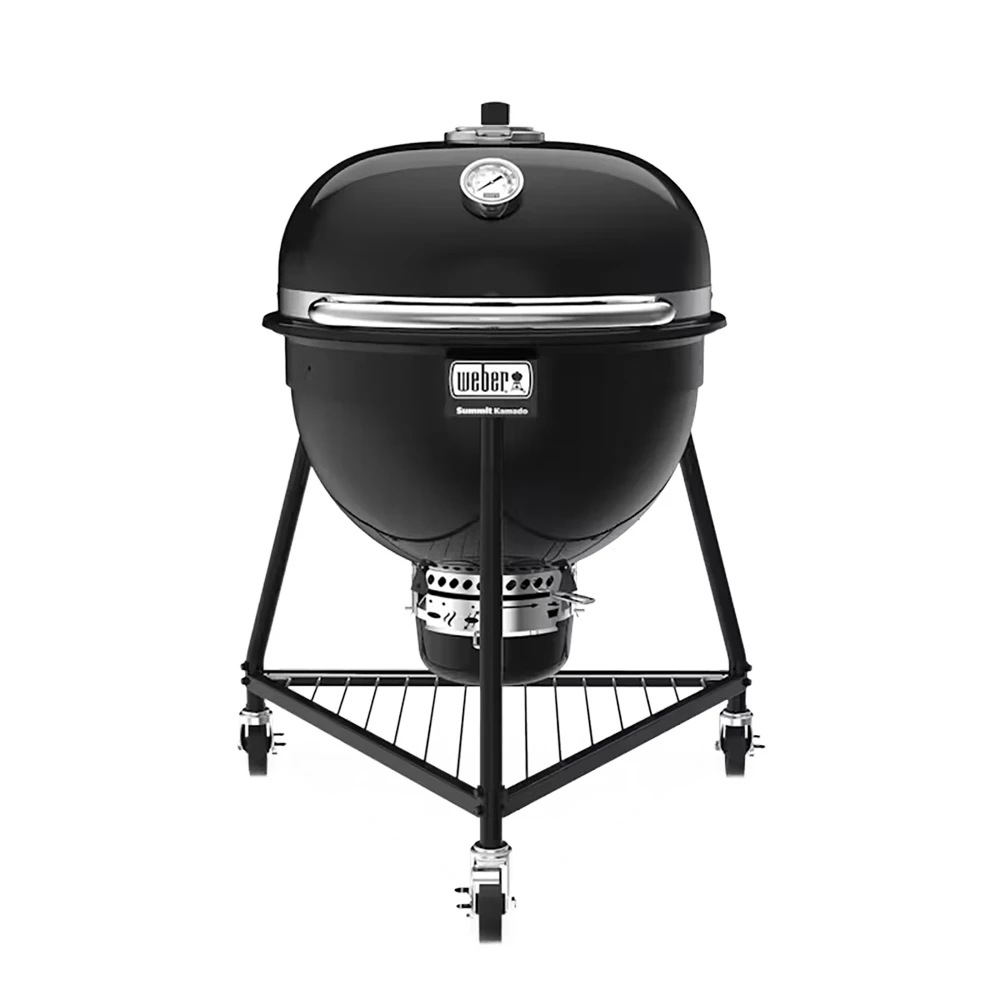 Taking the classic design of the Weber kettle grill and making it bigger and bolder in every way, the Summit 24-Inch Kamado E6 Charcoal Grill with Stand is designed to make backyard grilling and smoking more easy and convenient. Made of premium-grade U.S. steel coated with porcelain enamel inside and out, the Summit Kamado grill features a double-walled bowl and lid. Air is trapped between the double walls and acts as an insulator, retaining heat and keeping the temperature consistent for up to 12 hours on a single load of charcoal. In addition, the air-insulated design allows the grill to respond to temperature adjustments much faster than grills made from ceramic. The 24-inch stainless steel cooking grate offers 452 square inches of cooking space, so you can cook for the whole family easily. The Summit Kamado grill also features the Gourmet BBQ System hinged cooking grate with a 12-inch insert that can be replaced with other components (sold separately) such as a wok or pizza stone, allowing you to cook a wider variety of food on the grill. With the two-position charcoal grate, you can set the grate low for smoking or high for high searing heat. For more improved cooking at low temperature, place the stainless steel heat diffuser plate just above the coals. The plate deflects heat away from food, keeping the consistently low. The Summit Kamado is designed to take the guesswork out of perfecting the airflow during cooking. Three bottom vent positions make it easy to dial in the right amount of air. Use the smoke setting to minimize the airflow, or open up the vent wide for searing with high heat. The RapidFire lid damper features a hinged design, so you can open it up for maximum airflow or adjust it side to side to dial in more precise temperatures. The Summit Kamado includes a heavy-duty, easy-open lid hinge that makes opening the lid nearly effortless. The lid also features a braided stainless steel gasket which seals the lid and the bowl, holding heat inside like a vacuum. The One-Touch cleaning system makes clean-up hassle-free. As you rotate the handle, three blades in the bowl move ash through the vents and down into the removable, high-capacity aluminum ash catcher below, which is enclosed to prevent ashes from blowing away and creating a mess. The heavy-duty steel cart features casters for easy mobility and tool hooks for storing your BBQ tools.