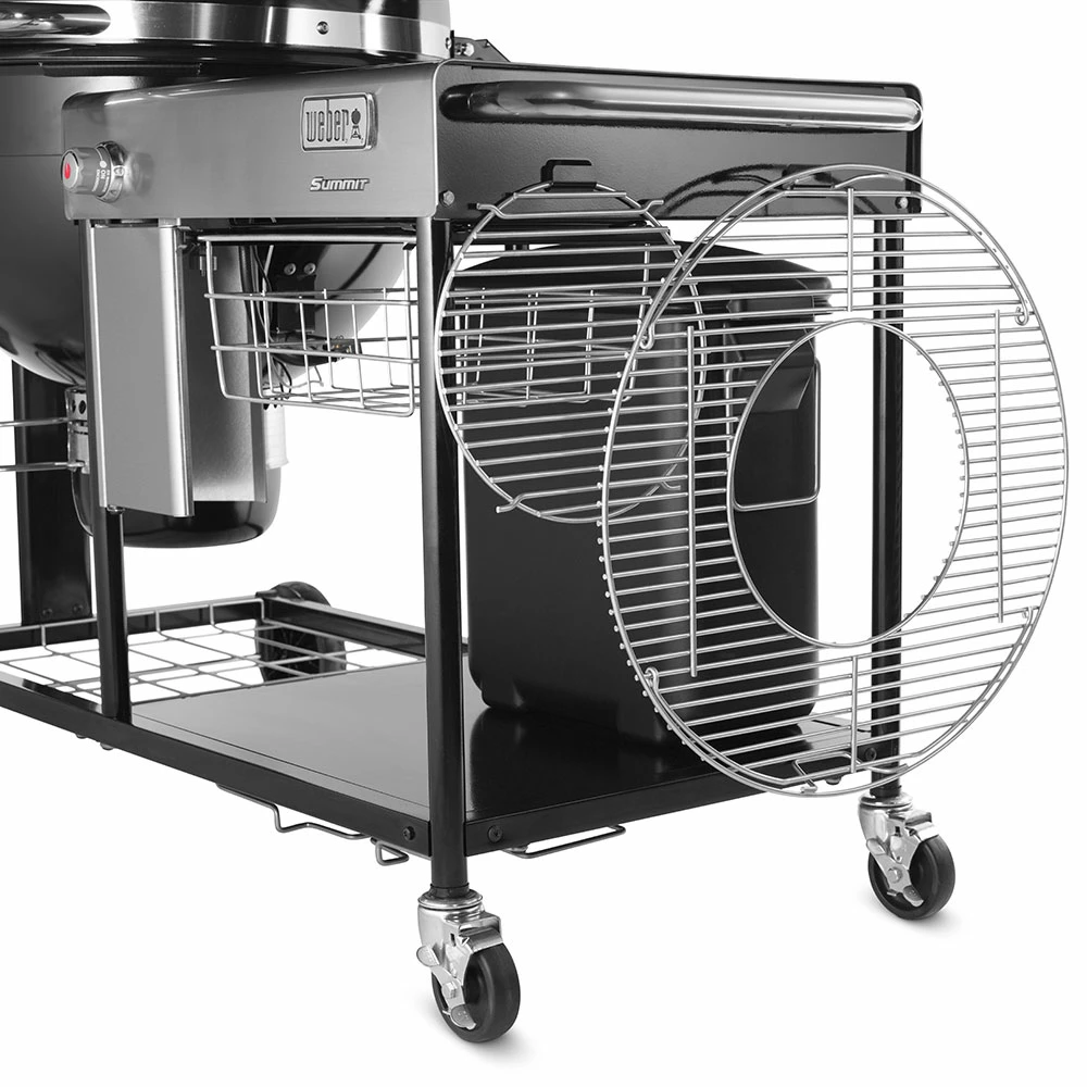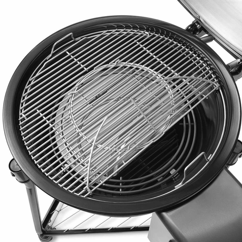 Taking the classic design of the Weber kettle grill and making it bigger and bolder in every way, the Weber Kamado Grilling Center is designed to make backyard grilling and smoking more easy and convenient. Made of premium-grade U. S. steel coated with porcelain enamel inside and out, the Summit Kamado grill features a double-walled bowl and lid. Air is trapped between the double walls and acts as an insulator, retaining heat and keeping the temperature consistent for up to 12 hours on a single load of charcoal. In addition, the air-insulated design allows the grill to respond to temperature adjustments much faster than grills made from ceramic. The 24-inch stainless steel cooking grate offers 452 square inches of cooking space, so you can cook for the whole family easily. The Summit Kamado grill also features the Gourmet BBQ System hinged cooking grate with a 12-inch insert that can be replaced with other components (sold separately) such as a wok or pizza stone, allowing you to cook a wider variety of food on the grill. The Snap-Jet gas ignition system runs off a 16-ounce propane cylinder so you can start the fire with a gas flame and be ready to cook in 15 minutes. With the two-position charcoal grate, you can set the grate low for smoking or high for high searing heat. For more improved cooking at low temperature, place the stainless steel heat diffuser plate just above the coals. The plate deflects heat away from food, keeping the consistently low. The Summit Kamado is designed to take the guesswork out of perfecting the airflow during cooking. Three bottom vent positions make it easy to dial in the right amount of air. Use the smoke setting to minimize the airflow, or open up the vent wide for searing with high heat. The RapidFire lid damper features a hinged design, so you can open it up for maximum airflow or adjust it side to side to dial in more precise temperatures. The Summit Kamado includes a heavy-duty, easy-open lid hinge that makes opening the lid nearly effortless. The lid also features a braided stainless steel gasket which seals the lid and the bowl, holding heat inside like a vacuum. The One-Touch cleaning system makes clean-up hassle-free. As you rotate the handle, three blades in the bowl move ash through the vents and down into the removable, high-capacity aluminum ash catcher below, which is enclosed to prevent ashes from blowing away and creating a mess. The Summit Kamado Grilling Center is equipped with a large, durable stainless steel table which provides ample space for food prep and serving. It also includes a removable Char-Bin storage container that holds up to 20 pounds of charcoal with a tight closing lid to keep moisture out. The heavy-duty steel cart features a bottom wire rack for extra storage space for grilling tools and accessories.