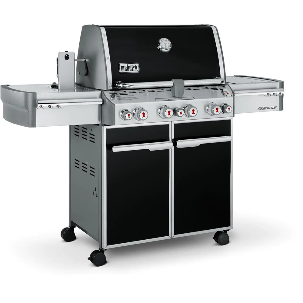 Summit Series gas BBQ grills are the crown jewels of the Weber family, with exclusive features, the highest level of performance and stunning looks. The Weber Summit E-470 is beauty redefined, but it adds more than just style to your backyard. The porcelain-enameled E-470 features 4 stainless steel burners that produce 48,800 BTUs and a 10,600 BTU Sear Station, each with Snap-Jet individual burner ignition to help you get the party started as quickly as possible. The Summit E series propane gas grill comes fully equipped with 9mm (3/8 inch) stainless steel rod cooking grates and stainless steel Flavorizer bars to effectively hold and distribute heat evenly over the 468 square-inch main cooking grid. The warming rack provides an additional 112 square inches for a generous 580 square inches of total cooking area. Summit grills come equipped with a stainless steel grease tray with a catch pan to make clean-up as easy as possible. This Weber E-470 also has a 12,000 BTU flush-mounted side burner that lets you multi-task while grilling, a stainless steel smoker box with a dedicated 6,800 BTU smoker burner and a 10,600 BTU infrared rotisserie rear burner. The Tuck-Away rotisserie system features a flip-up motor and separate spit rod and fork storage inside the cart. This Weber Summit grill has a porcelain-enameled frame and lid and a front-mounted control panel with LED lighted control knobs and a backlit LED propane scale, which works in conjunction with the precision fuel gauge to let you know exactly where you stand on fuel at all times. The attractive black hood has a polished handle and trim and a center-mounted thermometer to monitor cooking temperatures. The grill cart features an enclosed storage area to keep your propane tank out of sight and four heavy-duty casters (2 locking and 2 swivel). The two stainless steel side shelves provide expansive prep space and the six convenient built-in tool hooks keep your BBQ tools nearby. Light up your grill with the Grill Out handle light, which features an integrated tilt sensor that automatically turns the light on when the lid is raised and off when the lid is closed. With the Weber Summit E-470, welcome to the top-of-the-line! Please note, the grill height dimension listed in the specifications are with the grill lid open. Please note this Weber grill cannot be converted to run on a different fuel type. Be careful when selecting the fuel type desired.