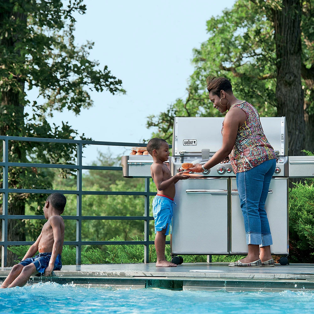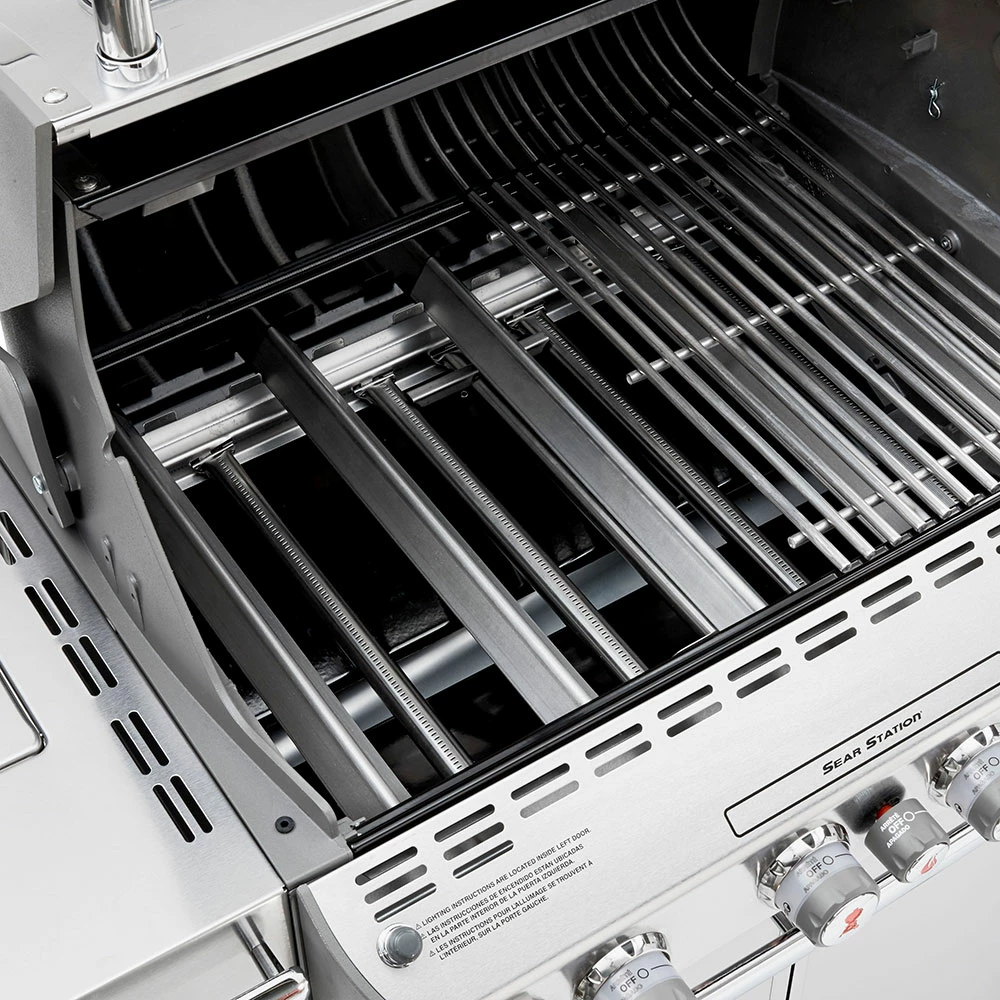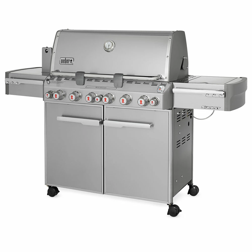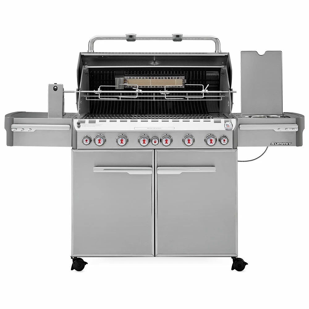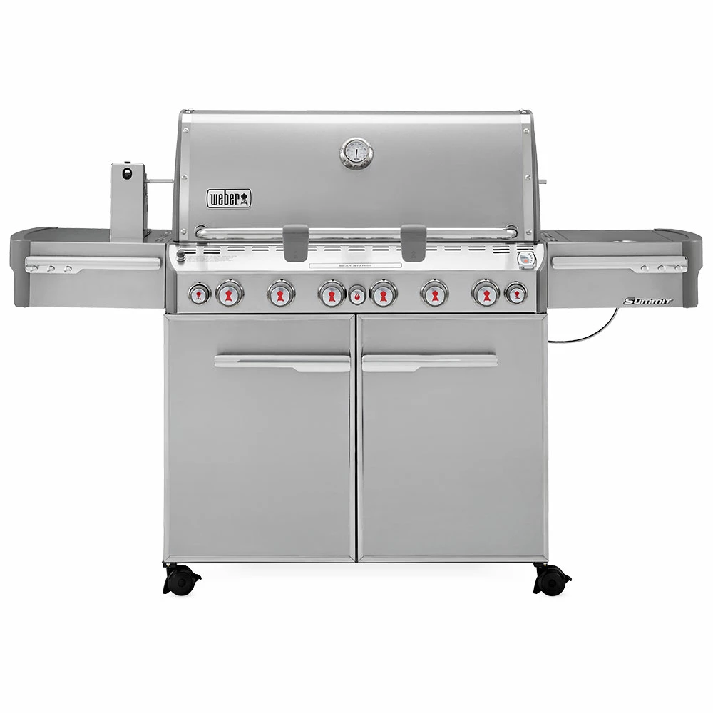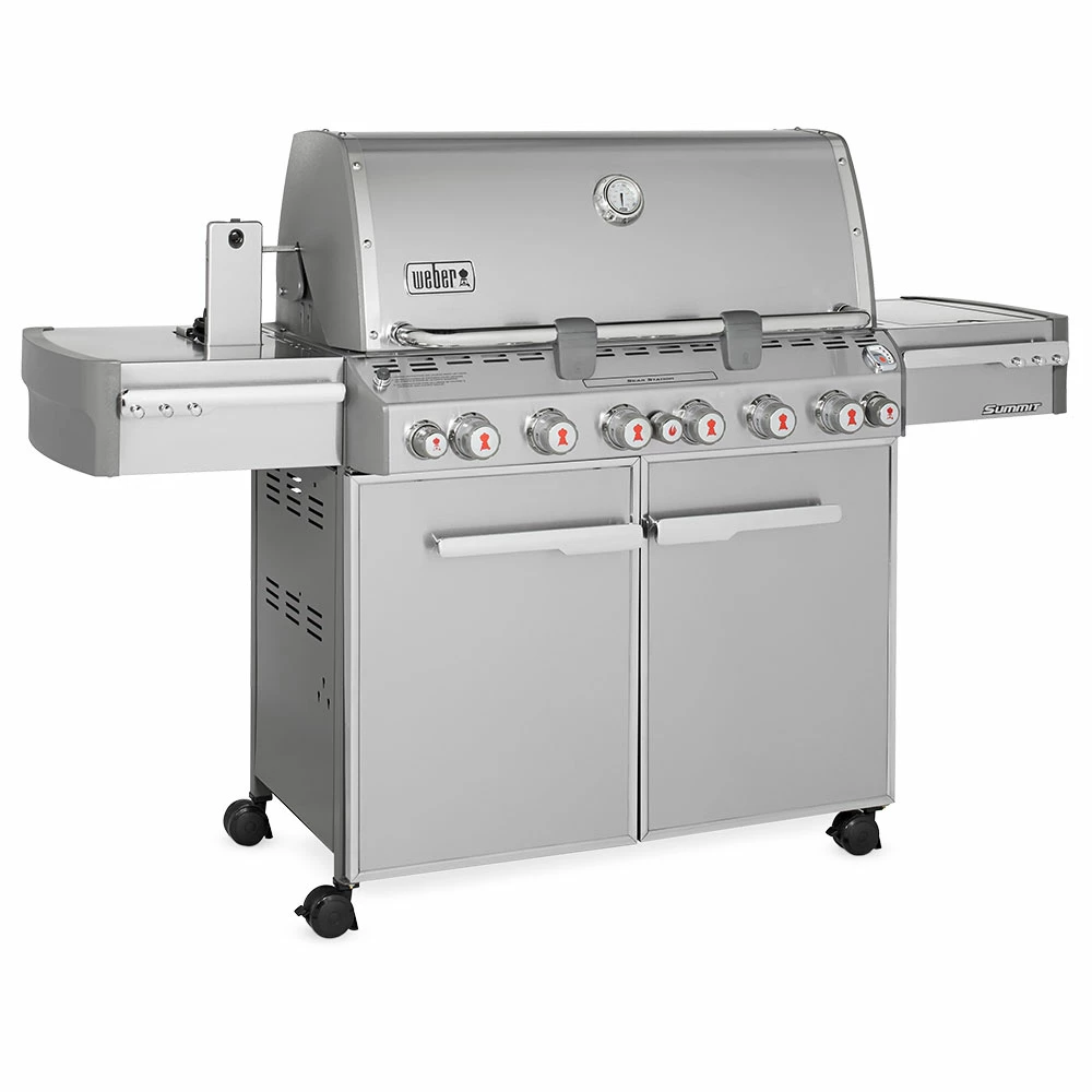 Summit Series gas BBQ grills are the crown jewels of the Weber family, with exclusive features, the highest level of performance and stunning looks. Weber packed all of their best features into this top-of-the-line grilling masterpiece, the Summit S-670, which is large enough for you to invite every single one of your friends over for a cookout. The stainless steel S-670 features 6 stainless steel burners that produce 60,000 BTUs and a 10,600 BTU Sear Station, each with Snap-Jet individual burner ignition to help you get the party started as quickly as possible. The Summit S series propane gas grill comes fully equipped with 9mm (3/8 inch) stainless steel rod cooking grates and stainless steel Flavorizer bars to effectively hold and distribute heat evenly over the 624 square-inch main cooking grid. The warming rack provides an additional 145 square inches for a huge 769 square inches of total cooking area. Summit grills come equipped with a stainless steel grease tray with a catch pan to make clean-up as easy as possible. This Weber S-670 also has a 12,000 BTU flush-mounted side burner that lets you multi-task while grilling, a stainless steel smoker box with a dedicated 6,800 BTU smoker burner and a 10,600 BTU infrared rotisserie rear burner. The Tuck-Away rotisserie system features a flip-up motor and separate spit rod and fork storage inside the cart. This Weber Summit grill has a painted steel frame and a front-mounted control panel with LED lighted control knobs and a backlit LED propane scale, which works in conjunction with the precision fuel gauge to let you know exactly where you stand on fuel at all times. The stainless steel shroud will withstand the elements for years to come and has a polished stainless steel handle and a center-mounted thermometer to monitor cooking temperatures. The grill cart features stainless steel doors, chrome plated cast-aluminum handles, painted side and rear panels and four heavy-duty casters (2 locking and 2 swivel). The enclosed storage area keeps your propane tank out of sight, two stainless steel side shelves with painted cast aluminum end caps provide expansive prep space and six convenient built-in tool hooks keep your BBQ tools nearby. Light up your grill with two Grill Out handle lights, which feature an integrated tilt sensor that automatically turns the lights on when the lid is raised and off when the lid is closed. With the Weber Summit S-670, luxury has officially arrived! Please note, the grill height dimension listed in the specifications are with the grill lid open. Please note this Weber grill cannot be converted to run on a different fuel type. Be careful when selecting the fuel type desired.